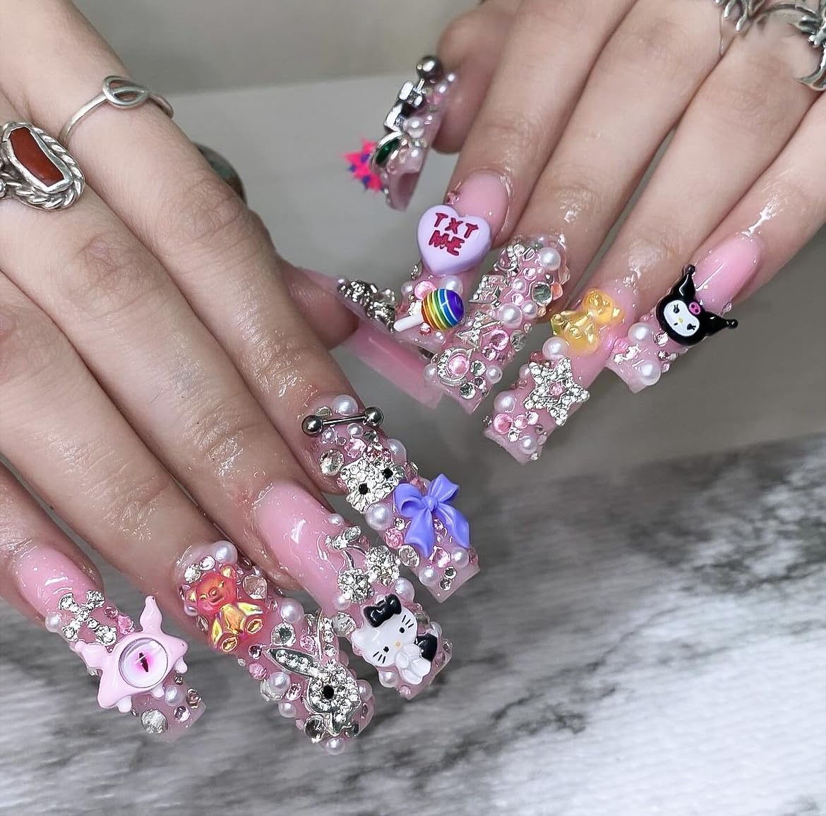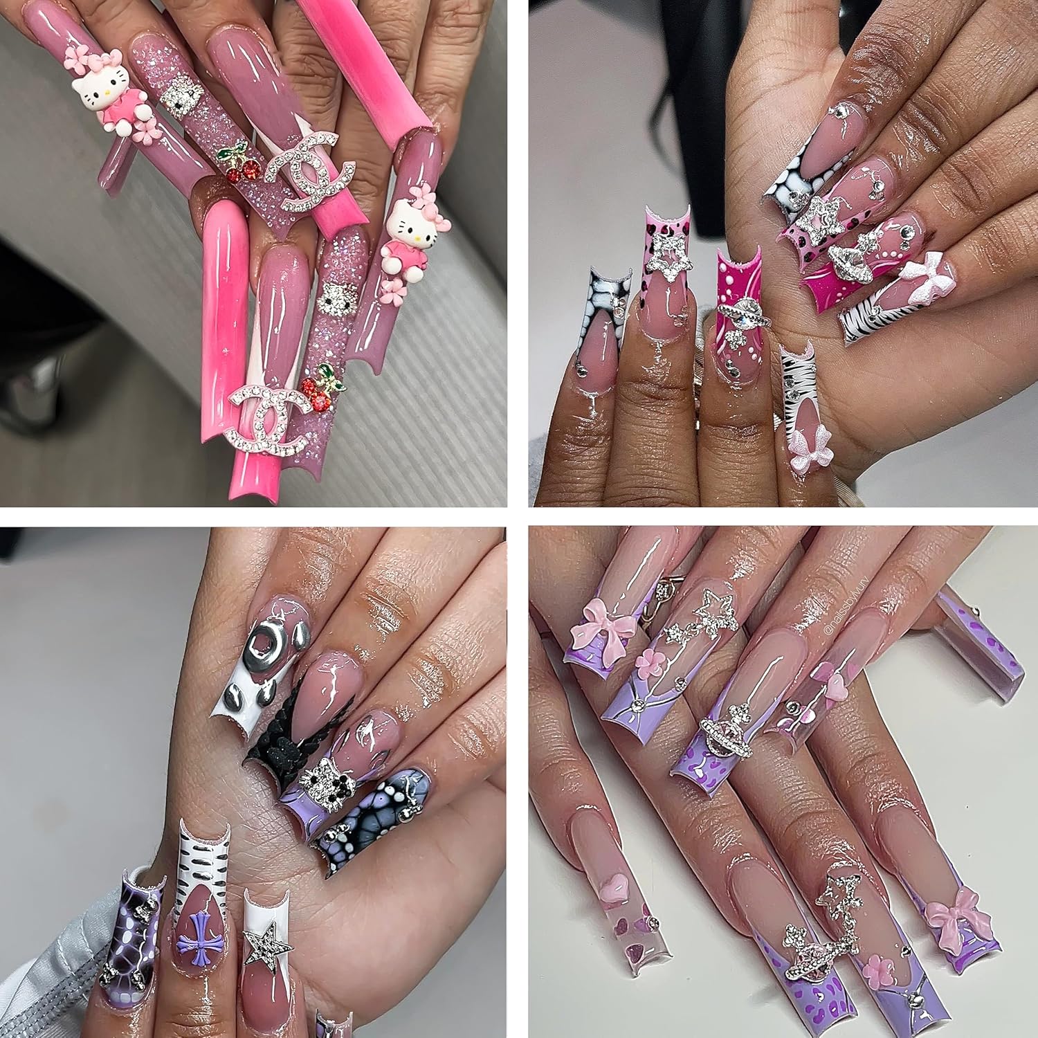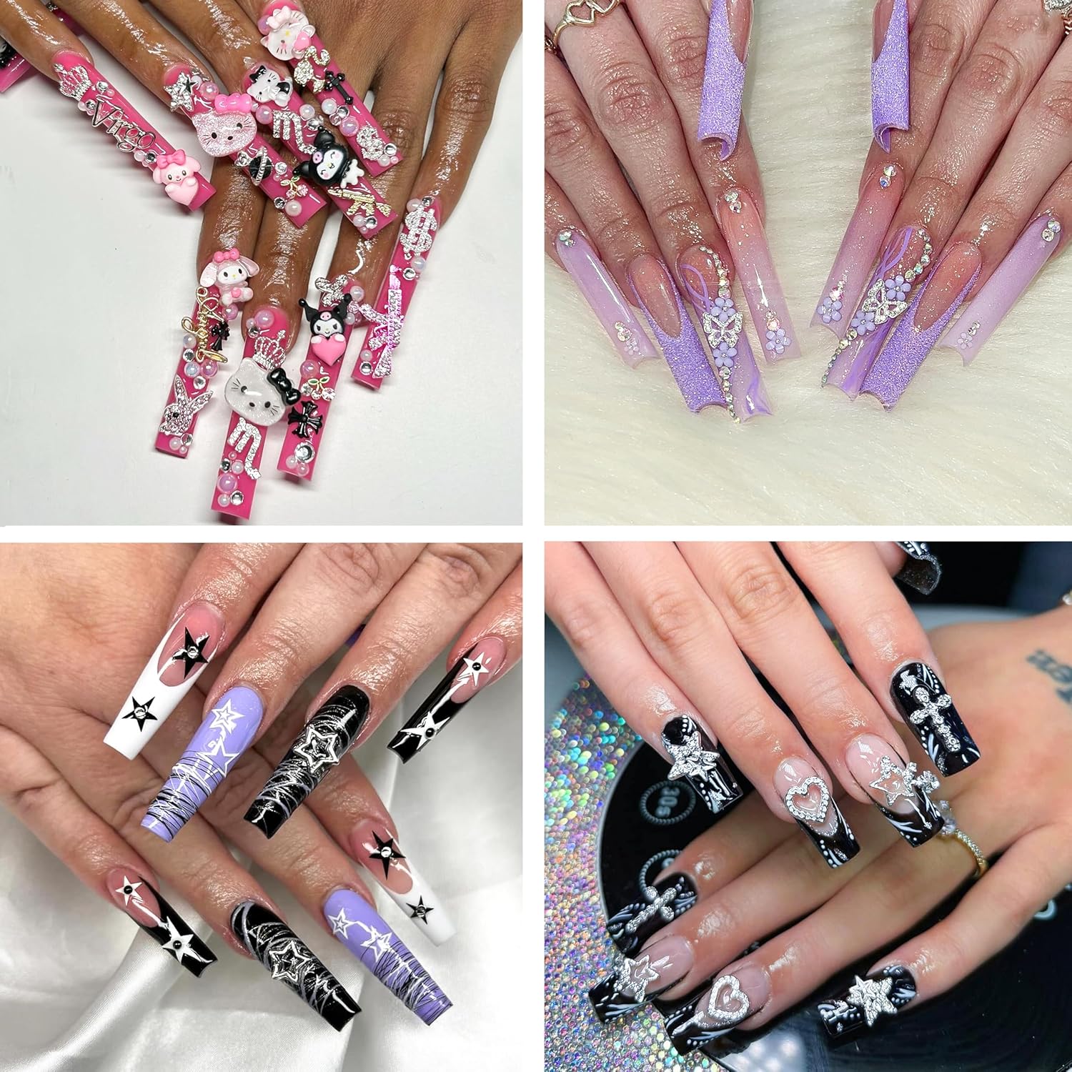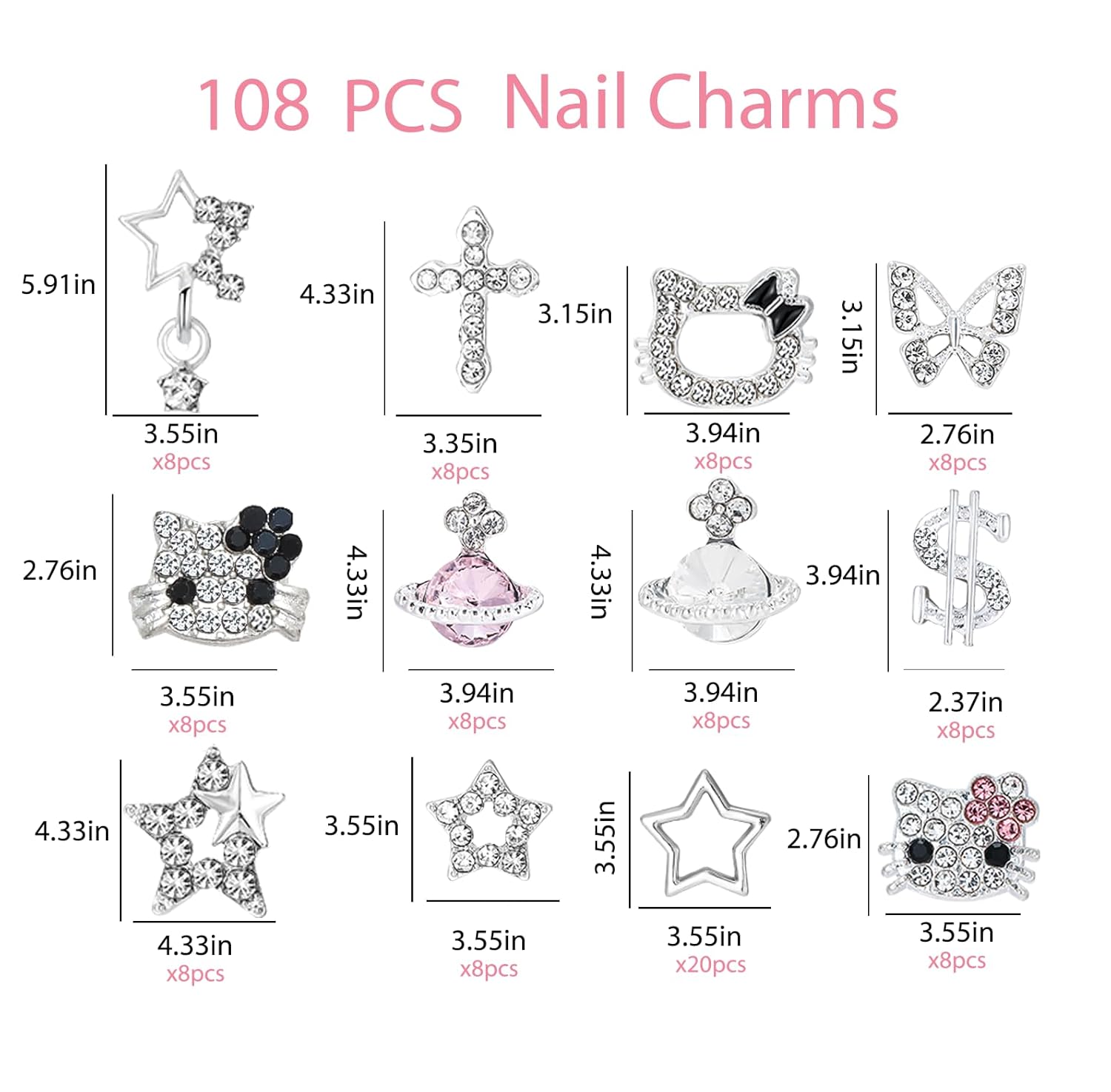 12 Styles: These Y2K nail charms accessories come in a variety of styles, from 3D Kawaii cartoons with silver rhinestones to 3D stars, crosses, butterflies, kitty charms, and other nail charms accessories. Let you create stunning and beautiful nail designed decorations.